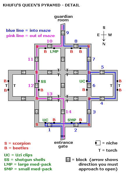 Karte des Labyrinths (© by Stella), unten ist der Eingang, die blaue Linie führt zum Schlüssel, die rote Linie wieder hinaus. SG2 Bevor du dort zum letzten Block kommst, ziehst du schwere Waffen, da dahinter ein Monster wartet (ich empfehle das Gewehr mit normaler Munition und auf der Stelle springen bzw. seitlich hin und her, um den Blitzen einigermaßen zu entkommen). Drinnen mußt du noch drei giftige Skorpione beseitigen SG3 und kannst dann den Schlüssel zum Ost-Schaft aus der Wand brechen. Kehre zurück zur Kreuzung und gehe nach rechts (Osten). Die Öffnung vor dem Block enthält ein Medipack und hinter dem Block lauert ein Skorpion. Der Gang führt zu einem weiteren Block mit Skorpion dahinter und einer Kreuzung, an der du geradeaus (Norden) weiter gehst. Vor dem nächsten Block liegt eine Öffnung mit Munition und dahinter ein Skorpion. An dieser Kreuzung gehst du nach links (Westen), um eine Kreuzung mit brennenden Fackeln zu erreichen. Hier geht es nach rechts (Norden) und immer geradeaus weiter, bis du dieses Labyrinth so verlassen kannst, wie du es betreten hast. SG4 Gehe draußen zur Grube und springe mit Anlauf auf den Felsblock an der großen Pyramide (also nach Osten). Von dort springst du mit Anlauf auf den nächsten Block im Norden (links). Hier darfst du aber nicht auf den nächsten, vorstehenden Felsblock springen oder ihn sonst wie betreten, da du so einen großen Käfer anlockst. Statt dessen springst du hoch, hängst dich an die Kante der Pyramide und hangelst nach links, bis du dich hochziehen kannst. Dort gehst du eine Ebene hinauf, springst aus dem Stand nach links oben auf die flache Schräge und dann noch einmal nach links oben weiter. Dort bleibst du aber stehen und wartest, bis ein paar Felsen herunter gefallen sind. Nun gehst du zum anderen Ende der Schräge und springst aus dem Stand nach links oben. SG5 Hier erlegst du gleich zwei große Käfer und gehst in den Eingang, wo du die Tür aufsperrst (wenn du einigermaßen schnell bist, brauchst du die Käfer nicht erlegen, sondern sperrst auf und läufst hinunter) und hinunter gehst... SG6 Anmerkung: