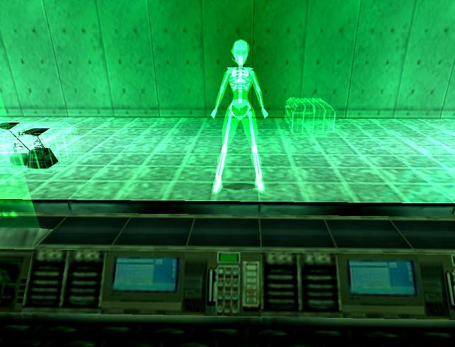 es wird noch besser! Hier kommst du in einen hellen Nebenraum mit sieben kleinen Containern. SG5 (442) Du bemerkst bei genauer Betrachtung, daß die Decke über dem Eingang Risse hat, was dich zu der Vermutung bringt, daß du sie durch hochspringen und festhalten öffnen kannst. Ziehe dich anschließend hoch und krieche in die Kammer, um dort mit dem Schalter den Röntgenblick zu aktivieren. Nun erkennst du, in welchen Containern die gute, alte Bombe tickt (falls du es nicht schon vorher unfreiwillig herausgefunden hast). Hole also aus dem "guten" Container die Teleporter Disk und schiebe sie in den Computer am Eingang des Teleporter Raums, um die Kiste zu aktivieren. Jetzt mußt du nur noch das Iris Artefakt in der Mitte des Teleporters einsetzen und schon wirst du (Spock läßt grüßen!) in den nächsten Raum gebeamt. Dort springst du in das Loch hinunter und kommst in einen Gang. Hinweis: diese Teleporter Disk ist immer im selben Container, also wenn man es mal weiß, muß man nicht mehr rumprobieren oder die Röntgenanlage einschalten. In allen anderen Containern sind Bomben.