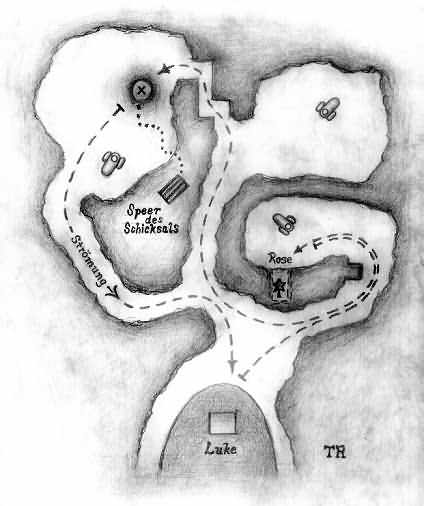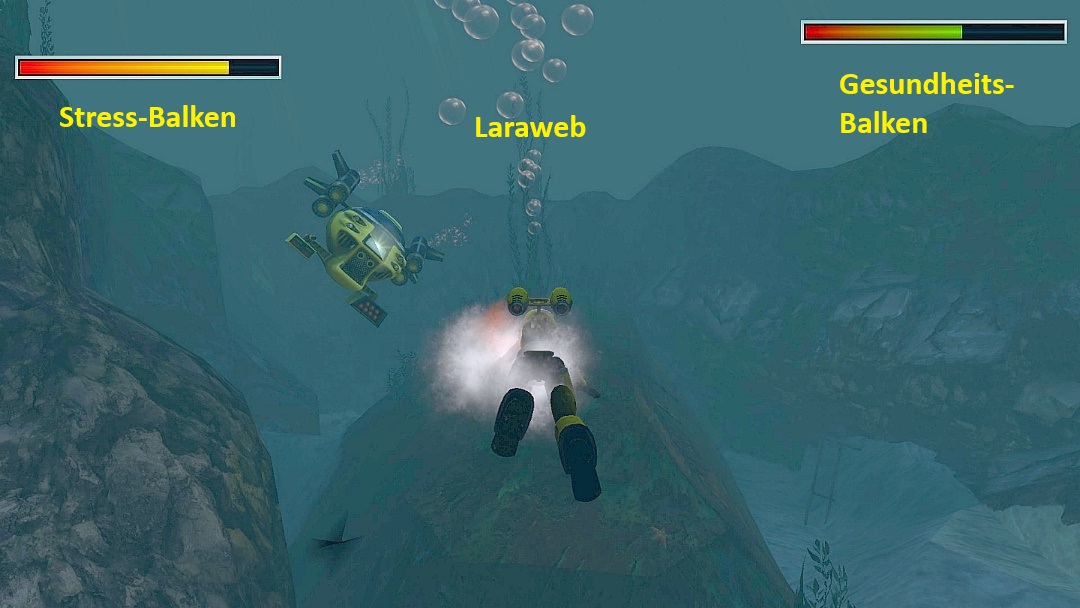 Lara trägt nun den Extremtiefen-Tauchanzug, der sich wie normales tauchen steuern läßt. Du solltest damit aber nicht allzu oft gegen die Felsen krachen, sonst wird die reichlich vorhandene Luft immer weniger, anscheinend kriegt das Ding dadurch ein Leck. Um die Sache zu vereinfachen, habe ich eine kleine Karte gepinselt, die dir den Weg in etwa verdeutlichen könnte. Erfolg: "Besonderheiten des nationalen Angelns" = Verwende alle zehn Düppel-Fackeln, um die Torpedos abzulenken. Das klingt jetzt einfacher, als es tatsächlich ist. Jede von deinen 10 Streufackeln = "Düppel-Fackeln" muß tatsächlich einen gegnerischen Torpedo ablenken! Also es haut NICHT hin, wenn du einfach nur alle 10 Fackeln abschießt. Ich habe es so gemacht, daß ich zu dem Eingang vom Geheimnis gewatschelt bin, dort bin ich immer im Kreis herum getaucht, und habe immer mal wieder eine Streufackel abgesondert. Nach jeder Fackel aber warten! Dann hat es so nach dem zweiten oder dritten Versuch geklappt, also es ploppt sofort auf, falls erfolgreich. Erfolg: "Tauch-Raider" = Lass das U-Boot von einem Torpedo treffen. Auch das ploppt sofort auf. Du mußt ein gegnerisches U-Boot anlocken, ich habe das zweite genommen, also nicht das beim Geheimnis, sondern das nächste, siehe oben auf meiner Karte, und das mußt du zurück zur Locke luken, ähm Luke locken, aus der du gekommen bist, also dem großen U-Boot, und dann feuert das Mini-U-Boot sicher auch mal auf das große U-Boot... Erfolg: "Stresslevel Null" = Mach Lara nicht nervös, bevor sie das Geheimnis lüftet und den Speer des Schicksals findet. Also du mußt das Geheimnis nehmen, und den Speer des Schicksals, und dabei darf der Stress-Balken, siehe unten, kein einziges mal aufleuchten! Was sich jetzt wilder anhört, als es ist, ich hatte es so nach ca. 15 Minuten, du speicherst halt nach jedem erfolgreichen Teilstück. Der Erfolg ploppt am Ende des Videos auf, wo Lara den Speer nimmt. Stress-Balken: der ist neu in der Remastered-Version und links oben, siehe Bild, und nur in diesem Level. Wenn Lara irgendwo anrumpelt, oder von einem Torpedo getroffen wird, kriegt sie Stress, was man auch daran erkennt, daß sie schneller schnauft. Der Stress-Balken geht mit der Zeit von selber wieder zurück. SG6 Von der Luke aus geht es nach rechts in ein Becken mit einem kleinen Tunnel und Geheimnis 1 (mehr gibt es hier nicht) sowie dem ersten Mini-U-Boot, das Torpedos abfeuert, was natürlich weniger gut ist. Deshalb hat Lara 10 Streufackeln oder auch "Torpedo-Täuschkörper", womit die Funktion eigentlich klar sein dürfte. Wenn du mit der Taste "Bindestrich" einen vom Stapel läßt, wird der nächste Torpedo davon abgelenkt. Dann geht es wieder zurück und immer nach rechts ins zweite Becken. Nach dem rechteckigen Gang tauchst du in das Loch hinab und durchquerst die verwinkelten Kammern (es gibt nur einen möglichen Weg), bis du eine Kiste erreichst. Drücke solange die Handlungstaste, bis Lara den Speer des Schicksals herausnimmt. Natürlich kracht dadurch die Bude ein und Lara hat ab jetzt nur noch die "normale" Atemluft (also 60 Sekunden), da der Anzug in dieser Beziehung seinen Geist völlig aufgegeben hat. SG7 Nun heißt es hurtig zurück und durch den Kanal mit der Strömung, um wieder schnell die Luke zu erreichen...