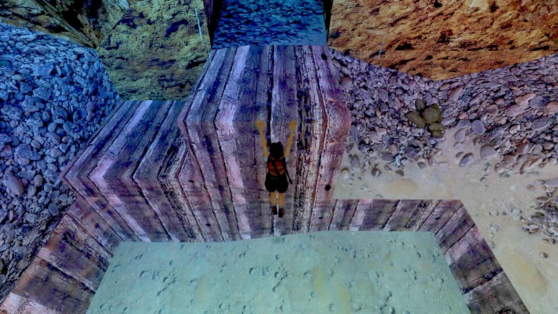 Die neuen TR 5 Remastered Erfolge, die man hier (in diesem Level) kriegen kann, stehen nun in der folgenden Lösung, die restlichen Erfolge stehen hier. Tomb Raider Remastered Steuerung. Wieder wichtiges BlaBla: nun geht es um die junge Lara, und wenn man das Video am Anfang in Augenschein nimmt, kann man sich vorstellen, was da gleich wieder kritisiert wurde. Meine Güte, wenn ich mir da viele andere Computerspiele so anschaue... Und was war dann eigentlich mit der Szene am Schluß von TR 2? Worum geht’s? Finde den Weg durch eine unheimliche Schlucht. Dahinter kommst du zu einem Galgenbaum und einem "Untoten", der sein Herz verloren hat. Wenn du es entdeckt hast, außerdem benötigst du unter anderem noch eine Eisenklapper, kannst du diese Schlucht verlassen. Erfolg: "Keine Impfung nötig" = Lass dich während des gesamten Durchgangs nicht von Ratten beißen. Der Erfolg ploppt am Ende dieses Levels auf, falls du es geschafft hast. Erfolg: "Ungeduld" = Lass dich nicht von den Imps im Level "Der Galgenbaum" verletzen. Und ich wußte jetzt nicht so definitiv, was die mit "Imp" meinen, aber hier steht's, das sind Kobolde bzw. Fabelwesen, also halt die lustigen Gesellen, die da rumrennen. Die große Schlucht SG0 Nun kommt eine Episode aus Laras Jugend: gehe nach links zum Abgrund und springe mit Anlauf auf den schrägen, bläulichen Felsen gegenüber. Hier springst du hoch an den Felsspalt, hältst dich fest und hangelst bis links um die Ecke, wo du dich fallen läßt. Drehe dich dort nach rechts und springe auf den schrägen, bläulichen Felsen, an dem du abrutschst und sofort die Kante greifst. Lasse dann los und du fällst auf einen kleinen Vorsprung hinunter. Hier siehst du rechts eine dunkle Höhle, die du mit einem "flachen" Sprung (vorher Handlungstaste drücken) erreichst. Dort mußt du dich sofort ducken, da hier einige Fledermäuse wohnen, die dir so nur wenig Schaden zufügen. Du findest Geheimnis 1 (Rose) und ein Medipack. Dann läßt du dich von der Kante der Höhle auf den Boden der Schlucht herab. Hier springst du nach rechts hoch zu dem Weg, auf dem du etwas weiter ein schwer erkennbares Medipack findest. Jetzt kehrst du zurück in die Schlucht, wo du einen quadratischen Vorsprung unterhalb einer Öffnung findest und besteigst. Dort drehst du dich nach links und springst einen Schritt vor der Kante auf den nächsten Fels und weiter zu einem Medipack (in der Ecke). Nun geht es wieder zu dem quadratischen Vorsprung und der Öffnung, durch die du wieder zum Beginn des Levels klettern kannst und wie am Anfang mit Anlauf auf den schrägen, bläulichen Fels springst. Hangle dort wieder bis ganz links um die Ecke und lasse los. Hier drehst du dich nach rechts, springst auf die bläuliche Schräge und hältst dich an ihrer Kante fest, um nach rechts um die Ecke zu hangeln, bis du über einer Öffnung hängst. Lasse los und halte dich sofort an der Kante der Öffnung fest, um dich hochzuziehen. Dahinter kommst du zu einem rechteckigen Block, von dem aus du hochspringen und dich unter der Brücke festhalten kannst (also oben an der Decke festhalten). Hangle hinüber, wo du rechts in der Nische ein Medipack findest und dann links die Schräge hinunter rutschst SG1, um beim Galgenbaum zu landen, auf den du zugehst und einen netten Herrn kennenlernst, der anscheinend irgendwo sein Herz vergessen hat. Unnötig zu erwähnen, daß eine Berührung mit dem Lagerfeuer keine Bereicherung für Laras Gesundheit darstellt. Obendrein lockst du, wenn du weiter gehst, einen bissigen Gnom an, der dir dauernd nachläuft. Gehe also lieber zurück auf die steinernen Stufen und in die Ecke links von dem Tunnel, aus dem du hier gelandet bist. Ziehe dich dort an der Kante hoch und springe sofort (bevor Lara wieder abrutscht) zurück auf die Mauer mit Geheimnis 2. (20/36)