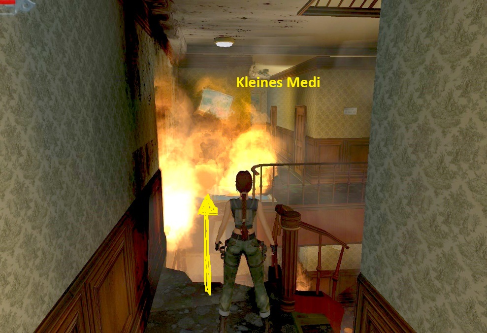 Remastered Version: du mußt den Schakal-Spazierstock nehmen, und dann ins Inventar gehen (Gegenstände), und ihn "benutzen", erst dann kommt der "Zimmer-Service", also die "Putzkraft", halt der Dödel... Und diese Munition, die man in der originalen Version unendlich oft nehmen kann, kann man jetzt nur einmal nehmen, außer wenn du im folgenden Gefecht alles wegballerst, dann kommt da angeblich wieder neue Munition. Es geht nun darum, daß du den Schurken mit ein paar Schüssen wieder zur Haustür treibst, denn dann wird er hinauslaufen, und damit die Laserfalle entschärfen. Er wird sich vermutlich irgendwo in der Küche verschanzen, dann läufst du hinauf ins Schlafzimmer, und wartest etwas, um dann über das Bad wieder hinunter zu schleichen, dann müßtest du ihn von hinten erwischen, und er wird zur Haustür laufen (hoffentlich). Da kann man jetzt keine exakte Beschreibung machen, man muß einfach vorher speichern, und es so oft probieren, bis es klappt. Dann kannst du durch die Haustür hinaus gehen - Savegame ungezipt (originale Version) (neueste Version von damals) sowie Anleitung für die Savegames - SG7 und nach rechts. Gehe dann links in das Zimmer, und sammle die Munition. Wenn du allerdings das zweite Magazin nimmst, wird der Schurke mit seinem MG die Wand einschießen, und du mußt vorher 100% Gesundheit haben. Schieße dann auf den Typen, allerdings ist ja deine Waffe ziemlich lahm im Vergleich zu seinem Raketenwerfer, also mußt du zwischendurch kurz mit Tab unterbrechen, und was für deine Gesundheit tun. Tip: gehe schnell zurück und hinter der Wand in Deckung, wo du in Ruhe Medipacks einnehmen kannst, und immer mal wieder ein paar Schüsse auf den Typen abgibst. SG8 Wenn der Fuzzy dann endlich das Weite gesucht hat, nimmst du seine Kanone. Savegame ungezipt (originale Version) (neueste Version von damals) sowie Anleitung für die Savegames. Untersuche noch mal alle Bereiche, die du erreichen kannst, z.B. Die Tür mit dem roten Schild "Sortie" (das heißt "Ausgang", soweit ich der französischen Sprache mächtig bin), und gehe dann durch den Durchbruch, den der Schurke gerade geschossen hat, und in den Gang, wo du zwischen zwei Laserfallen stehst. Hinweis: hier auf der obersten Ebene des explodierten bzw. brennenden Treppenhauses liegt hinten am Ende des Gangs ein kleines Medipack, du kannst es mit der Kamera sehen. Man kann tatsächlich zu dem Feuer hinüber springen, nach rechts daran vorbei gehen, und zum Ende des Gangs gehen, das Medipack holen, und genauso wieder zurück gelangen, immer knapp am Feuer vorbei. Screenshot. Drehe dich nach rechts, und krieche am Boden (Zifferblock 1 plus Enter) unter den Laserfallen hindurch. Wenn du weiter gehst, explodiert das Treppenhaus. Springe rechts hinunter auf die andere Treppe, und lasse dich bei dem kaputten Geländer auf den Boden hinab. Hier gibt es ein paar Wertsachen. Dann gehst du wieder hinauf, und in den nächsten Gang. Am anderen Ende siehst du den Schurken. Gehe durch die noch nicht aktivierte Laserfalle, und nimm links die Munition. Laufe dann nach links zu der Tür, wo weitere Munition liegt, und zur anderen Tür. Hier siehst du, daß die Laserfalle ab und zu deaktiviert wird, in diesem Moment läufst du hindurch, ziehst die Waffen, und feuerst auf den Schurken... (oder du schießt schon vor dem Laser auf ihn)