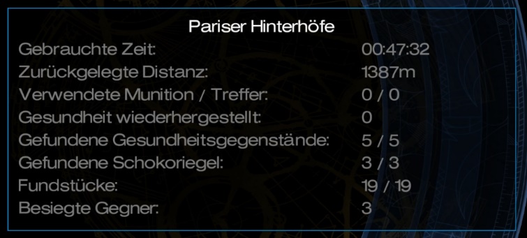 Statistik: Man kann jederzeit mit der Zurück-Taste (Back Button) am Gamepad ins Hauptmenü des Spiels gehen, da sieht man (unter anderem) links oben den gesammelten Euro-Betrag, und dann auf "Statistiken" weiter unten gehen, dort sieht man unter anderem die Gesundheitsgegenstände, Schokoriegel und Fundstücke mit der tatsächlich gefundenen und maximal möglichen Anzahl im aktuellen Level. Beispiel. Statistik hier: Gesundheit: 1, Schoko: 2, Fundstücke: 10