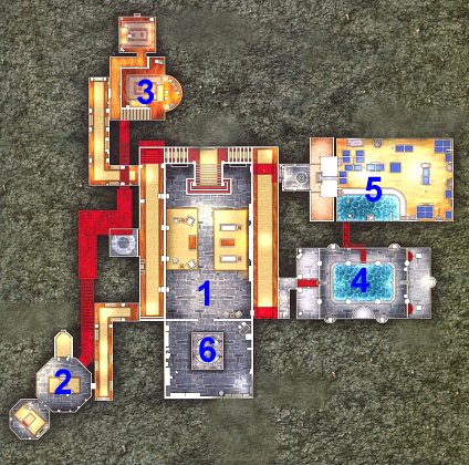 1 Foyer 2 Schlafzimmer 3 Arbeitszimmer 4 Pool 5 Hindernis-Bahn 6 Tech-Center Schätze: 1 Gold, 10 Silber, 16 Bronze Worum geht's? Croft Manor ist anscheinend eine Art Ersatz für "Laras Anwesen" bzw. Trainingslevel in den alten Spielen TR 1 - 3. Schaus dir einfach an. Es gibt hier allerdings auch Schätze zu finden, die dazu zählen, wenn du das Spiel zu 100% meistern willst. Denke ich mal. Und hier ist auch Laras Kleiderschrank, wo man die freigeschalteten Klamotten anprobieren kann. Denke ich mal. Also jedenfalls ist hier ein Kleiderschrank... Und los geht's Gehe durch die Glaswand ins Tech-Center (6) und benutze den Laptop am Boden, um aus dem Safe den Metallhaken zu holen. Gehe dann die Treppe hinauf und links, dann immer weiter, bis du im Schlafzimmer bist. Gleich links sind zwei Schalter, die dir die Pistolen bescheren. Hinter dem Bett ist ein Bronze-Schatz 1. In dem kleinen Nebenraum kann sich Lara umziehen, wie viel Klamotten im Schrank sind, hängt allerdings davon ab, ob du die Schätze jeweils zu 100% gefunden hast, und ich kann dir gleich sagen, daß du dir da keine falschen Hoffnungen machen solltest, selbst wenn du alles findest, sieht es immer noch ziemlich leer im Kasten aus. Gehe jetzt wieder in Richtung Foyer, aber nicht die Treppe hinunter, sondern die Tür links zum Arbeitszimmer in dem du auf dem großen Schreibtisch das Lichtsystem findest. Dann geht es die Treppe hinauf und in den kleinen Raum liegt ein Bronze-Schatz 2, dann ziehst du an dem Hebel in der Ecke, und findest einen weiteren Bronze-Schatz 3. Danach gehst du wieder hinunter und zerschießt die Bretter in der Ecke beim Eingang, dahinter ist ein Silber-Schatz 1. Dort ist ein kleines Bücherregal, das du auf einen der beiden Bodenschalter neben dem Schreibtisch schiebst. Wenn du auf die Wand schaust, wo die Treppe anfängt, siehst du das zweite Regal, das du mit dem Magnethaken herunter holen kannst. Schiebe es auf den anderen Bodenschalter, worauf sich dort die Wand öffnet. Knips die Taschenlampe an und gehe hinein. Hinter den Kisten ist an der Wand ein Gesicht mit einer großen Zunge, an der du ziehst, und dann wird an der Wand eine Inschrift freigelegt, die du mit der Aktions-Taste lesen kannst: Über den Wassern wenden sich zwei Schwestern den Rücken zu, auf daß der Pfad unbewacht bleibe (Goldschatz-Hinweis 1) Nimm dann den gut sichtbaren Silber-Schatz 2 und zerschieße die drei Kisten für einen Bronze-Schatz 4. Am Ende des Ganges ist eine weitere "Zunge", die den Zugang zum Schlafzimmer ermöglicht.