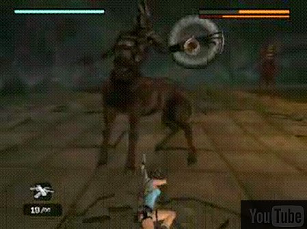 Nachtrag 2014: ich habe es gerade auf der XBox 360 geschafft. Man muß einem Pferd ein Schild wegreißen, eins reicht, man braucht nicht alle beide wegreißen! Das geht nur mit diesem Adrenalin-Move! Man schießt auf ein Pferd, bis es wütend wird, d.h. der untere rote Balken ist voll (von den zwei Balken rechts oben). Wichtig: jetzt kommt der Adrenalin-Move, aber der funktioniert nur, wenn man weiterhin auf dieses Pferd zielt. Aber nicht schießen! Sondern schießen aufhören, aber weiterhin auf dieses Pferd zielen! Das ist der Knackpunkt!!! Dazu muß man am XBox-Controller normalerweise immer die linke Trigger(Feuer)Taste: LT zusätzlich noch gedrückt halten!!! LT > siehe hier (unten). Also weiterlaufen, linken Trigger gedrückt halten, sodaß Lara weiterhin auf den Gaul zielt, und dann warten, bis B (rollen) erscheint, dann sofort rollen, in irgend eine Richtung - immer noch mit gedrückter Zielen-Taste! Dann sieht man zwei Kreise, dann warten, bis sie über dem Kopf des Gauls zusammen gekommen sind, dann schießen! Das war dann der erfolgreiche Adrenalin-Schuß, und das Pferd stolpert nach vorne, und erst jetzt kann bzw. muß man schnell sein Schild mit dem Magnethaken wegreißen. Anders kann man das Schild nicht wegreißen, nur mit einem erfolgreichen Adrenalin-Angriff!!! Das Schild liegt dann in der Mitte des Platzes. Jetzt immer ganz nahe um das Schild herum laufen, und weiter schießen. Wenn wieder so ein grüner Energiestrahl von einem Pferd kommt, muß man jetzt schnell das Schild nehmen, und zum Gaul drehen, sodaß der Strahl zurück auf das Pferd gelenkt wird. Das wird dann versteinert (grau), und jetzt muß man schnell das Schild hinlegen, und auf dieses Pferd schießen. Das muß man eventuell zweimal machen. Und natürlich auch noch mit dem anderen Gaul! Also das wichtige ist, daß der Adrenalin-Move nur funktioniert, wenn man weiterhin auf das Pferd zielt!!! Nur zielen, nicht schießen, wenn der rote Adrenalin-Balken voll ist. Dann warten, bis das Rollen-Symbol kommt, schnell in irgend eine Richtung rollen, warten, bis die zwei Kreise zusammenkommen, dann schießen! Bei mir war der Fehler, daß ich nicht weiterhin auf das Pferd zielte, wenn der Adrenalin-Move kommt! Dann geht es nicht. Aber so ging es dann recht schnell, und man braucht auch nur wenige Medipacks! "Zielen" heißt, daß Lara mit den Waffen auf den Gegner zeigt, aber nicht schießt, also nur "anvisieren"! Dafür gibt es eine eigene Taste! Wenn es nicht geht, empfehle ich PC-Spielern ein Microsoft Gamepad für PC (oder kompatibles Gamepad) zu verwenden, oder den Trainer mit One-Shot-Kill, siehe hier. Bei der Playstation dürfte ja die Steuerung praktisch genauso wie bei der XBox sein, also dort gibt es auch eine eigene Taste zum zielen, die muß man halt zusätzlich gedrückt halten für einen erfolgreichen Adrenalin-Angriff. Nachtrag 2015: mir ist es hier auch mal passiert, daß ich das Schild wegreißen konnte, aber es lag dann nicht am Boden, sondern einen Meter in der Luft, und Lara konnte es nicht nehmen. Dann habe ich das Schild vom anderen Pferd weggerissen, und damit ging es dann. Und ja, ich spiele das Spiel immer wieder, um meine Lösung zu überprüfen, ergänzen, verbessern... Der Kampf (nicht nur) für PS2-Spieler (gefunden von Latrine):