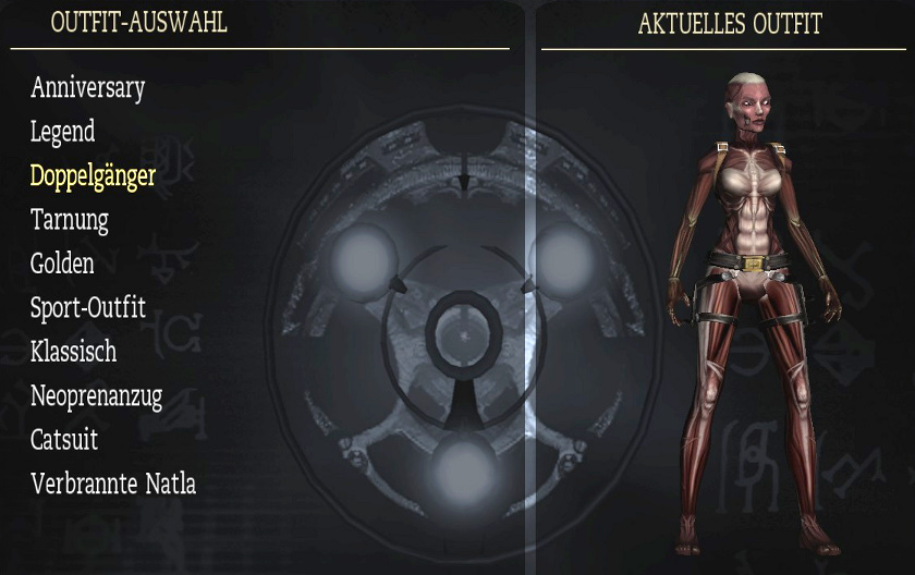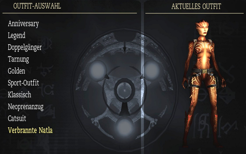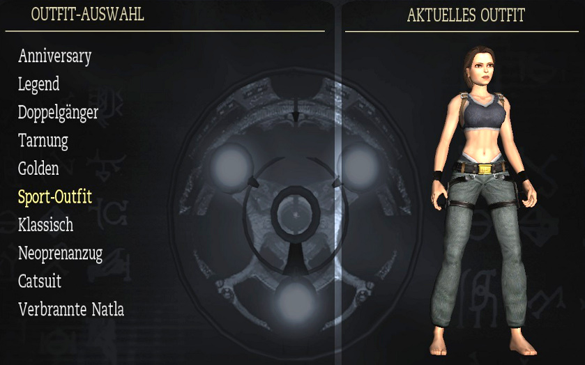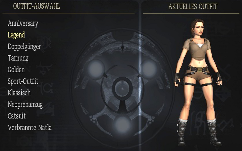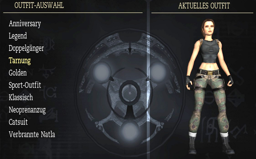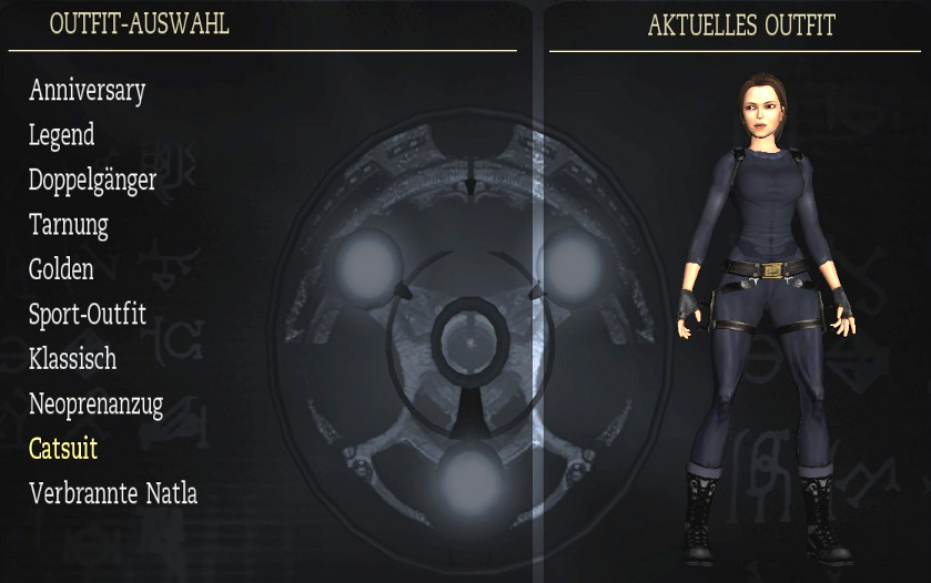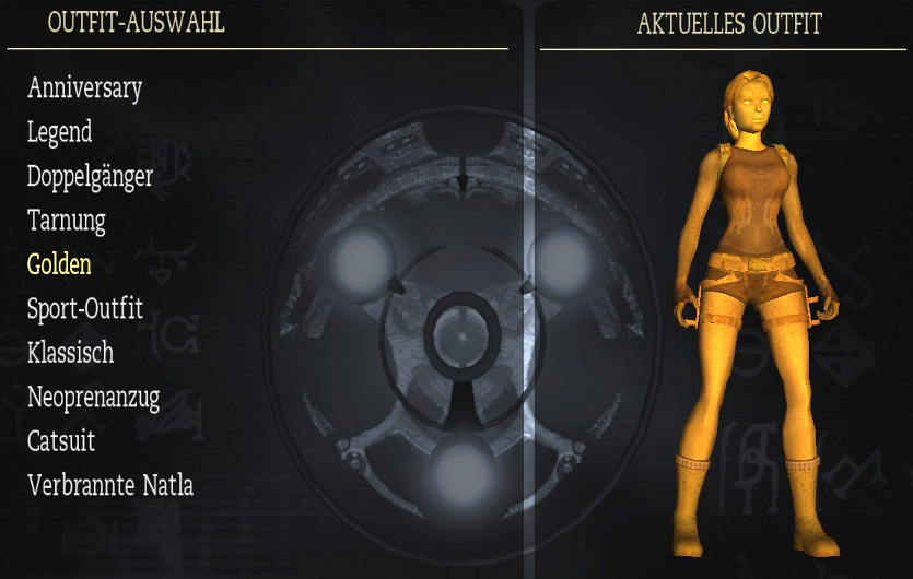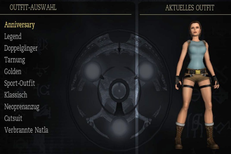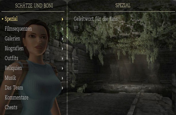 meiner Lösung. Biografien: da steht eine kurze Beschreibung der Hauptfiguren. Man muß dafür möglichst viele Artefakte finden. Outfits: das sind Laras Klamotten, und man muß dafür möglichst viele bzw. alle Relikte finden. Man kann die Outfits zu Beginn eines Levels wechseln, oder in Croft Manor im Schlafzimmer, beim Kleiderschrank. Hier sind alle Outfits: Klicken zum vergrößern! Reliquien: da steht eine kurze Beschreibung der bereits gefundenen Relikte. Musik: hier kann man sich die musikalische Untermalung von allen Leveln nochmal anhören. Man muß das Musikzimmer in Croft Manor erreicht haben, und das jeweilige Level bzw. Levelabschnitt beendet haben. Das Team: da kommt der Abspann des Spiels. Kommentare: wenn man ein Kapitel beendet hat, kann man es nochmal spielen, und die Kommentare einschalten, und zwar über Optionen - Anzeige - Kommentar-Markierungen: Ein! Also hier sieht man, wo das schon freigeschaltet ist. Wenn man dann ein Level nochmal spielt, sieht man ab und zu große blaue Kristalle, da geht man hin, und drückt die Handlungstaste, und dann hört man die englischen Kommentare der Entwickler zu dieser Stelle, und wenn mich nicht alles täuscht, ist einer davon der berühmte Erfinder von Tomb Raider: Toby Gard. Klicken zum vergrößern! Cheats: nun wird es natürlich wieder interessant! Hier sieht man die bereits freigeschalteten Cheats, die man aber über den Optionen Bildschirm erst einschalten muß. Also hier sieht man sie nur. Die Cheats werden freigeschaltet, indem man in einem ganzen Kapitel (also z.B. Peru oder Griechenland) alle Zeitspiele schafft. In Croft Manor gibt es zwar auch ein Zeitspiel, das schaltet aber keinen Cheat frei. Generelle Anmerkung: wenn dir noch Artefakte oder Relikte fehlen, kannst du ein Level erneut spielen, und sie noch holen. Wenn du auf erneut spielen gehst, siehst du ja bei jedem Level, ob dir da noch was fehlt. Und beim erneut spielen kannst du auch bei der Schwierigkeit das Zeitspiel wählen, und auf Zeit spielen, um die Cheats freizuschalten. Die Zeitspiele sind für PC-Spieler mit Hilfe eines Trainers ziemlich locker zu schaffen, siehe auch meinen ultimativen Ratgeber (eine Seite vorher). Wenn du ein Level erneut spielst, mußt du hier alles nochmal machen, es sind auch wieder alle Gegner da, aber du hast alle bereits gefundenen Artefakte und Relikte schon, und mußt nur noch die fehlenden holen. Beim Zeitspiel brauchst du die Artefakte natürlich nicht holen, hier geht es ja auf Zeit. Aber wenn du ein Level erneut spielst, um die fehlenden Artefakte zu holen, kannst du die Schwierigkeit natürlich auch auf Leicht stellen (und/oder einen Trainer verwenden, da manche Artefakte natürlich nicht leicht zu kriegen sind). So, das war's mal fürs Erste, ich ergänze das hier vielleicht noch später etwas genauer mit Fotos der Klamotten usw... (Nachtrag: die Klamotten hab ich jetzt, aber vielleicht fällt mir irgendwann noch was ein...)