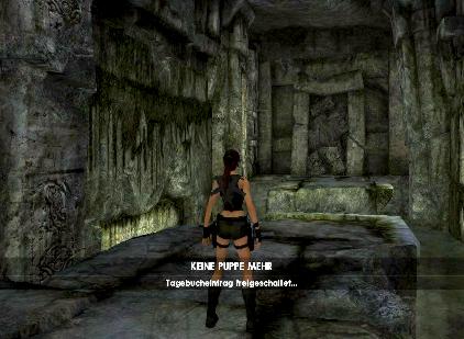 Worum geht's? Nicht viel los hier, und keine Ahnung, warum das Level "Keine Puppe mehr" heißt... Tauche nach rechts hinten zu Schatz 29 und ziehe dich wieder zum Eingang hinauf. Klinke deinen Haken an dem Ring ein, und springe vor, mauerlaufe hinüber und springe rückwärts ab (etwas schwierig, weil man die richtige Richtungstaste drücken muß). Springe links an den Kanten hinauf und an die Stange. Wenn sie ganz unten ist, läßt du los und tauchst in den Gang, wo es oben zwei Luftlöcher gibt, da ja Lara jetzt keine Taucherausrüstung mehr hat, und unten liegt Schatz 30 rum. Tauche dann weiter, ziehe an dem Rad und tauche auf. Nun schwimmst du hurtig zu deinem Schlauchboot... (auf Youtube nenne ich mich aus gesundheitlichen Gründen "Prediger Krause")