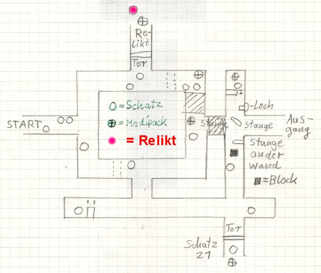 Worum geht's? Walhall ist der Sage nach der Ruheort der gefallenen Krieger. Wer die Autobahn A3 bei Regensburg befährt, hat sicher auch schon mal die prächtige Walhalla gesehen. Jedenfalls besorgst du dir hier Thors Hammer, wobei du es mit ein paar großen Versionen selbigen Hammers zu tun hast... Das Labyrinth Anmerkung: hier hörst du dramatische Musik, das heißt, es laufen ein paar Hirschkäfer herum! Wenn du den letzten Konfuzius erlegt hast, ist die Musik aus! Das heißt, jetzt kannst du in Ruhe Tomaten züchten... (und du solltest hier in den Optionen des Spiels die Helligkeit auf Anschlag stellen) Du bist nun in einem kleinen Labyrinth (siehe Karte), und die Schätze 7 bis 20 liegen verteilt in den Gängen herum, und für Schatz 21 mußt du hinten den Steinblock zu der Stange schieben, aber nicht direkt darunter, sonst kann Lara die Stange nicht ganz hinunter ziehen! Springe auf den Block, dann an die Stange und dann schnell auf deinen Roller, den du dort kurz vor der dreieckigen Durchfahrt geparkt hast, und fahre schnell geradeaus über die Schräge und zum geöffneten Tor. Achtung: das ist etwas knifflig! Du mußt warten, bis Lara die Stange ganz herunter gezogen hat, dann schnell bzw. sofort loslassen, und auf deine Gehilfe steigen, und losdonnern! Das sind Zeittüren, also sie bleiben nur kurz offen, und schließen sich dann wieder, also du mußt schnell sein! Ansonsten zurück, und nochmal versuchen! Der dortige Hebel bringt dich wieder hinaus. Nun machst du praktisch nochmal das selbe, indem du die Stange, die dort am Boden liegt, dort in das Loch an der Wand einsetzt (siehe Achtung!). Danach fährst du wieder durch den dreieckigen Durchgang und über die Schräge, dann rechts, rechts, links, rechts, rechts, links, und durch das geöffnete Tor, hinter dem das Relikt liegt. Danach gehst du dort in den Gang, wo die Stangen sind, und springst mit einem Mauersprung zum Ausgang = Savegame (Spielstand) Relikt, aber Achtung, bei diesem Savegame besucht dich dann gleich ein Ameisenbär. Hinweis: das Relikt zu kriegen ist nicht sonderliche schwer, es sollte nach dem zweiten bis dritten Versuch eigentlich klappen... Karte für das Labyrinth (klicken zum vergrößern) Wildes Rumgehüpfe Beseitige den Zwerghamster und nimm Schatz 22. Dann gehst du auf die Brücke, wo Action angesagt ist: wenn sie einbricht, und die Zeitlupe beginnt, springst du nach vorn an die Kante, hangelst schnell nach links weiter, springst an die nächste Kante, läßt dich auf die Stange hinab, hangelst an ihr schnell bis zum Ende, läßt dich auf die Schräge fallen und springst auf den Balken. Hier hast du erst mal Ruhe. Springe an die Säulenkante, hangle herum und lasse dich auf den nächsten Balken hinunter. Springe an die nächste Säulenkante, hangle herum und ziehe dich am Ende hoch. Springe über die Lücke an die nächste kleine Säulenkante, gehe oder hangle herum, und springe mit einem Mauersprung nach oben auf den Weg. Dort springst du an die Säulenkante, hangelst um die Ecke, läßt dich eine Kante hinunter (festhalten!), dann noch eine Kante und ziehst dich auf sie hoch. Springe an die Kante an der nächsten Säule, lasse dich auf den Balken hinab und springe an die nächste Säule, hangle um die Ecken, lasse dich auf den Balken hinunter und springe zur nächsten Säule. Hangle um die Ecke, ziehe dich hoch und begib dich mit einem Mauersprung nach oben auf die Säulenspitze. Das ist ja der Hammer... Springe zu dem Weg hinauf, und gehe auf dem langen, brüchigen Teil schnell weiter zum Medipack. Dort springst du nach links und holst aus dem Nebenraum Schatz 23. Nun geht es zurück und in den nächsten Nebenraum mit Schatz 24 und zwei Wanderschnecken. Hier springst du an eins der Gewichte, wenn es unten ist, dort eine Kante höher und an eine der Stangen ab. Von dort geht es weiter an die Kette und hinüber zum Ausgang. Nimm das Medipack und schwinge im Gang über die Stangen weiter. Dort mußt du hinauf zur letzten Stange springen und an den Hammer schwingen, an dem du nach rechts hangelst und ein paar Seemöwen beseitigst. Springe dann an die Mauerkante ab, wenn der Hammer drüben ist, dort geht es nach rechts weiter auf den nächsten Hammer. Gehe dort in den Gang, springe über die Walzen, watschle unter den nächsten Walzen durch und springe über die letzten Walzen. In den Ecken liegen Schatz 25 und ein Medipack. Hangle an der rechten Kette hinüber und lasse dich auf die letzte Stange hinunter (festhalten!), von der aus du an das Gewicht schwingst. Lasse dich zum Boden hinab, beseitige die zwei Streifenhörnchen und ziehe den Stein bei dem einen Zahnrad weg. Diesen Stein schiebst du zum blockierten Ausgang, so erreichst du Schatz 26 und beseitigst dort auch gleich ein bis zwei Elche. Nun geht es zurück zu den Zahnrädern und du schiebst den Stein zu einem der zwei Gewichte, um an seine Kante zu springen. Dann mußt du in der bekannten Technik wie vorhin wieder hinauf und ebenso an den Hammer springen, dort nach rechts hangeln und auf der anderen Seite an die Mauerkante abspringen. Hangle nach links in den Gang und werfe im Nebenraum deinen Haken an den Ring, um dich so weit wie möglich abzuseilen. Nun mauerläufst du nach rechts an die Mauerkante (festhalten!) und beseitigst noch ein paar Nebelkrähen. Dann geht es nach rechts weiter (immer schön festhalten!) zu der Plattform mit Schatz 27. Springe hinüber zum Ausgang und gehe in die Halle, wo du auf die Spitze der Säule springst und auf den Balken abrutschst. Gehe zur nächsten Säule, springe an ihre Kante und hangle links herum. Ziehe dich hoch, springe auf die Plattform ab und über die kleinen Platten weiter an die nächste Säulenkante. Dort hangelst du rechts herum, ziehst dich hoch und springst mauermäßig nach oben = Kontrollpunkt, wo du schnell den Bademeister begrüßt. Nun geht es in den Nebenraum, beseitige den Oberförster, und schwinge mit dem Haken an die Wand gegenüber, mauerlaufe nach links an die Kante, springe ein